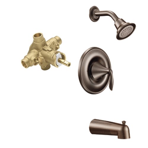 Eva Posi-Temp Single Handle Tub and Shower Set by Moen. Includes lever handle and M-PACT PosiTemp rough in valve. PosiTemp pressure balancing valve maintains water pressure and controls temperature. Includes showerhead and arm. Diverter tub spout. ADA Compliant. Showerhead: 2.5 GPM. 7 13/16 Inches showerhead reach. 6 1/2 Inches tub spout reach. 7 1/2 Inches diameter faceplate. Valve: 1/2 Inches IPS connection. T2133ORB-2570.
